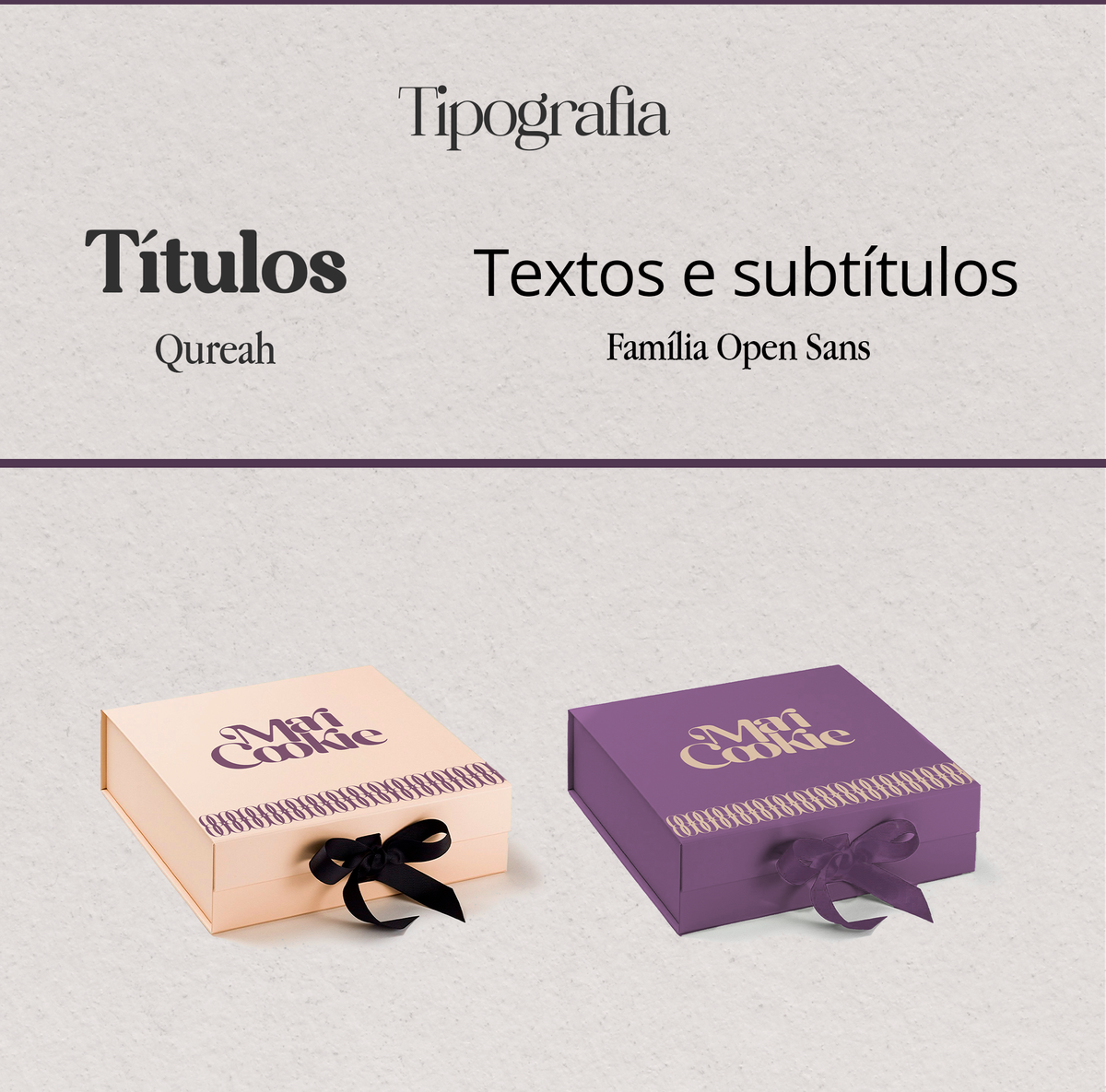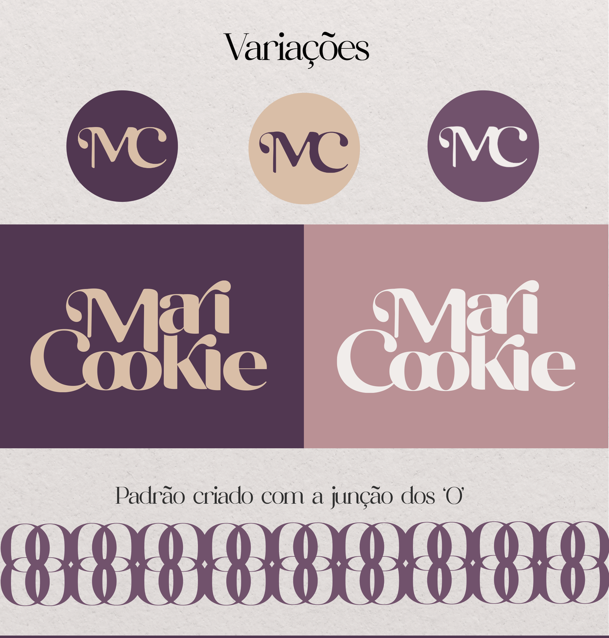 Além disso, o padrão gerado pelo entrelace dos 'O's' da palavra "cookie" é um toque de criatividade que reforça o conceito da marca de forma sutil. Esse padrão pode ser aplicado em várias peças gráficas, agregando coesão à identidade visual e destacando os produtos da Maricookie.