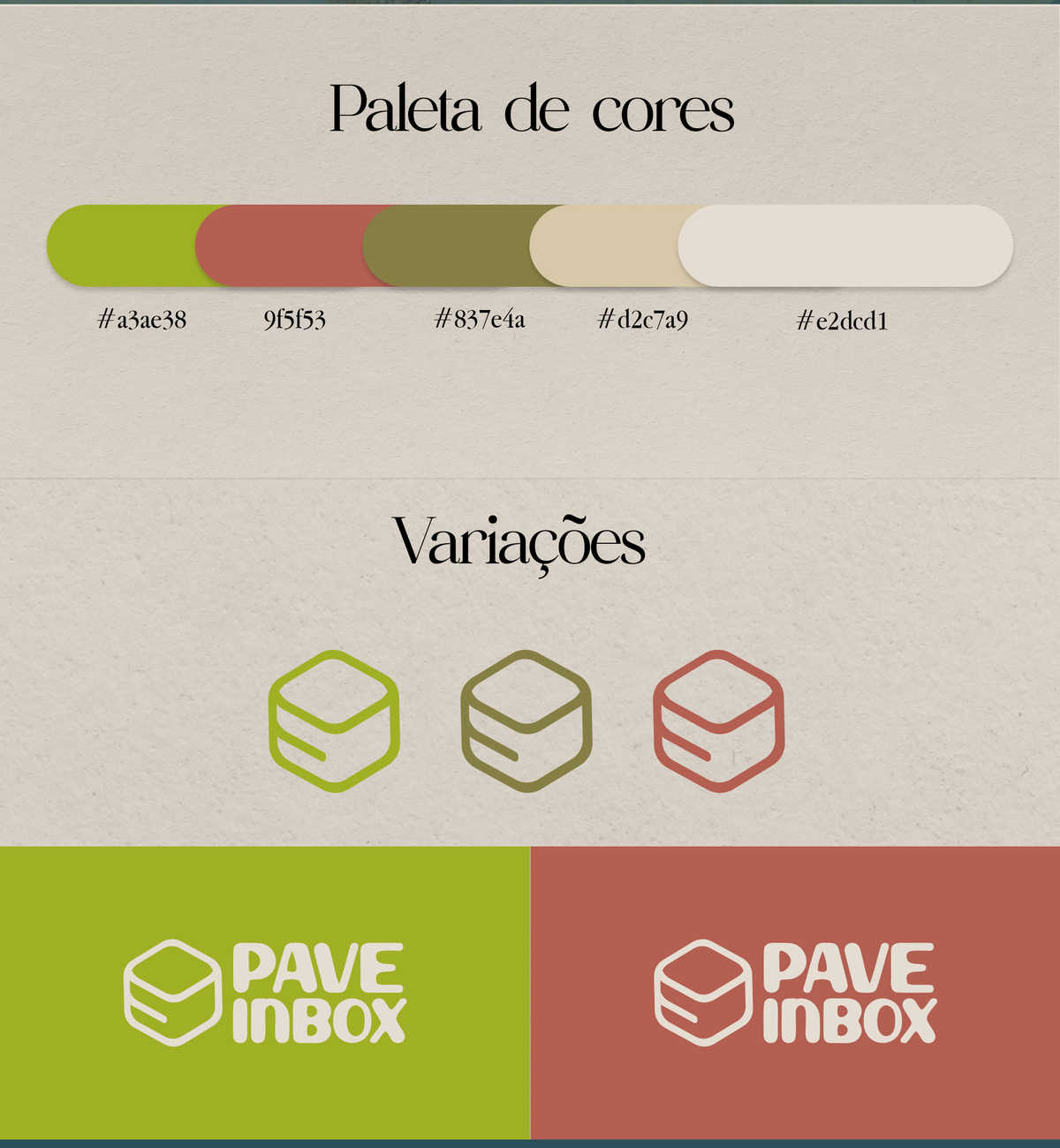 Após um estudo de marca e análise de briefing chegamos ao conceito central da marca. Pave Inbox é uma marca que transmite diversão, alegria, descontração, criatividade e ousadia em cada detalhe. Desde a paleta de cores vibrantes até a escolha única da tipografia e do símbolo, cada elemento foi cuidadosamente selecionado para transmitir a essência única da marca.